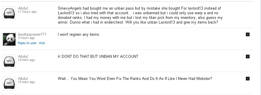 You know, any owner that allowes a player that you can say anything about him is the best owner I think, an owner like bestteam who really only wants good words about him from the players, is the one, for me, who is the more bigger dmb fk. I hate it that you must obey the staff even if they do wrong things, I feel like they want to boast that they can do anything on the server and people must obey them (Eg: Jags). The only mods that did care for us players were JINXSPR0 and Daniellosboy. These both mods were strict but they cared for players also, like jinxs mostly used to stop us from pvping and unless stubborn players still pvped, then he used to jail. Daniellosboy never boasted about him being mod or you could say "abused" his commands like how Jags does. And also I have something about bestteam also, he never cares for players unless they donate him. The terms & conditions on the store say that: